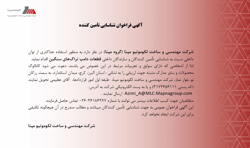 شرکت مهندسی و ساخت لکوموتیو مپنا (گروه مپنا) در نظر دارد به منظور بهرهگیری حداکثری از توان تولیدکنندگان داخلی، نسبت به شناسایی تأمینکنندگان و سازندگان داخلی قطعات دامپتراکهای سنگین اقدام نماید.